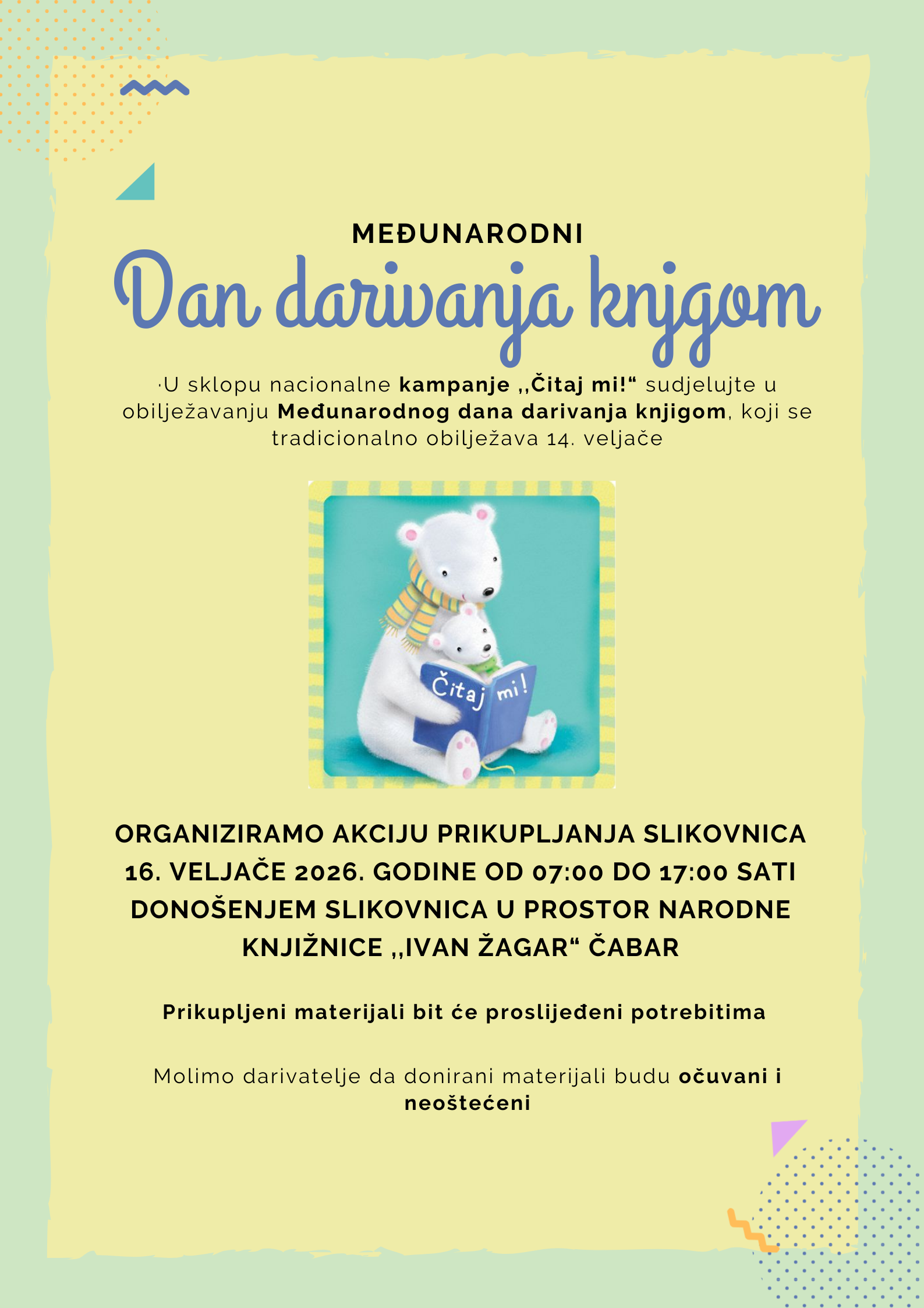 U sklopu navedenog obilježavanja organiziramo akciju prikupljanja slikovnica. Pozivamo sve građane da se akciji pridruže 16. veljače 2026. godine od 07:00 do 17:00 sati donošenjem slikovnica u prostor Narodne knjižnice ,,Ivan Žagar“ Čabar. Prikupljeni materijali bit će proslijeđeni potrebitima.
