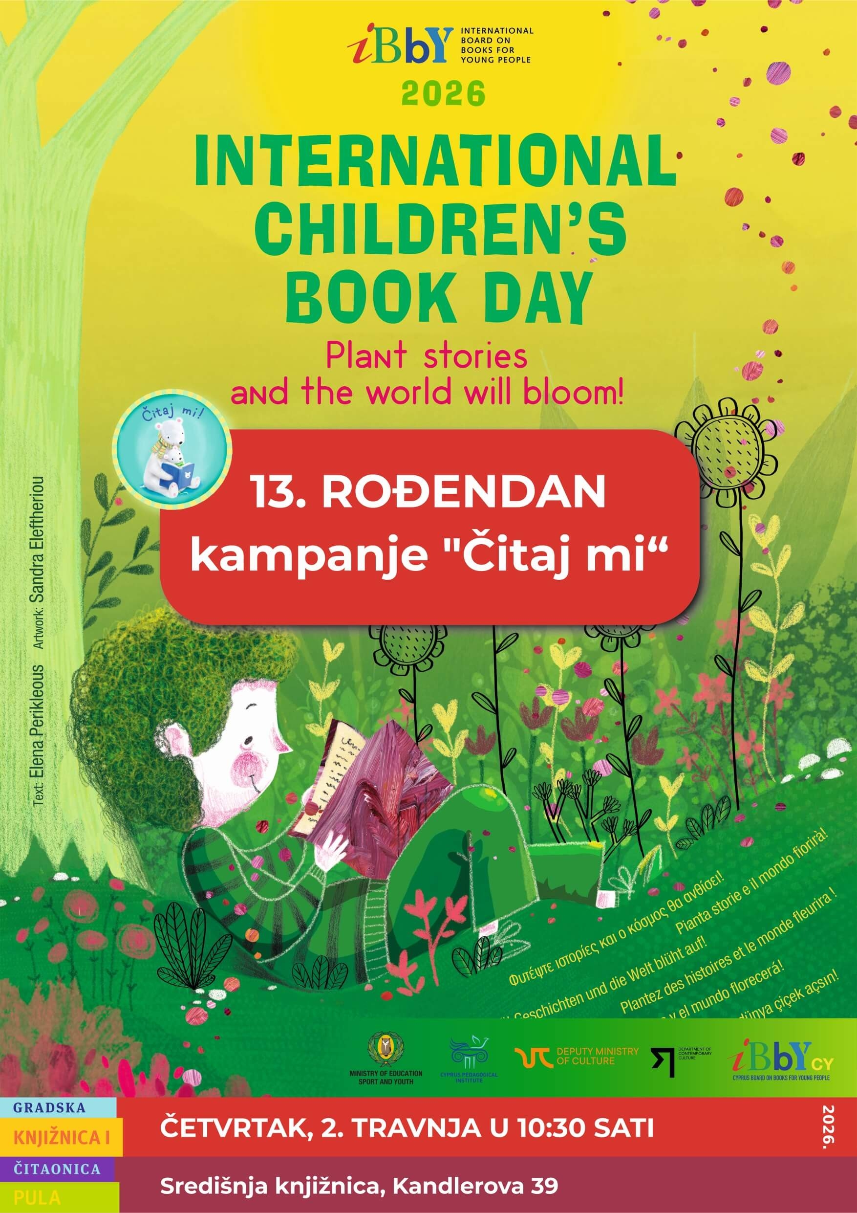 Središnja proslava 13. rođendana nacionalne kampanje za poticanje čitanja naglas djeci od rođenja Čitaj mi! održat će se u Središnjoj knjižnici Gradske knjižnice i čitaonice Pula, 2. travnja 2026., na Međunarodni dan dječje knjige.